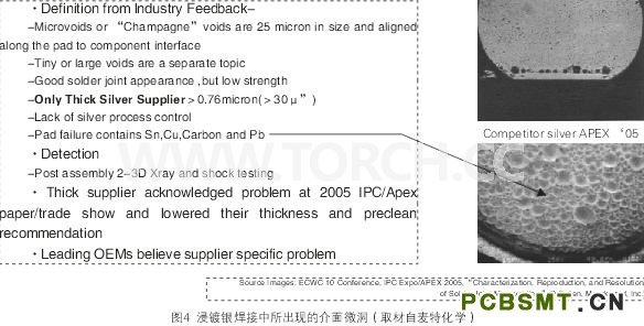 此種介面性微空洞不但在PCB浸鍍銀的焊接中出現(xiàn),也會(huì)發(fā)生在OSP與ENIG等皮膜之焊接中,其根本原因到目前為此尚未徹底搞清楚。不過也找到某些確定的相關(guān)成因,例如厚度加厚者微空洞也較多(尤其當(dāng)厚度超過15μin者),然而某些配方也未必全然如此。此外底銅面的粗糙度也是原因之一,通常愈粗愈糟。且還發(fā)現(xiàn)與配方中的有機(jī)物含量與成份有關(guān),某些有機(jī)物則容易伴隨銀金屬產(chǎn)生共鍍而存在于皮膜中。不過這種假設(shè)性的理論,曾經(jīng)通過某些品牌商(OEM)、代工組裝業(yè)者(EMS)、PCB業(yè)者,與藥水供應(yīng)商等,所共同組成聯(lián)盟的多次合作研究,竟然沒有一次模擬成功,當(dāng)然也就無法將微洞徹底予以排除了(見下頁圖4)。
