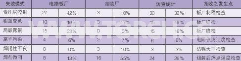 所訪查的對(duì)象是來自64家PCB廠及29家組裝客戶共93個(gè)參與的業(yè)者,從其失效或被拒收板類中,可歸納出有關(guān)浸銀皮膜的六個(gè)主要缺失,下表1中即按其重要性而對(duì)其失效內(nèi)容加以分類。