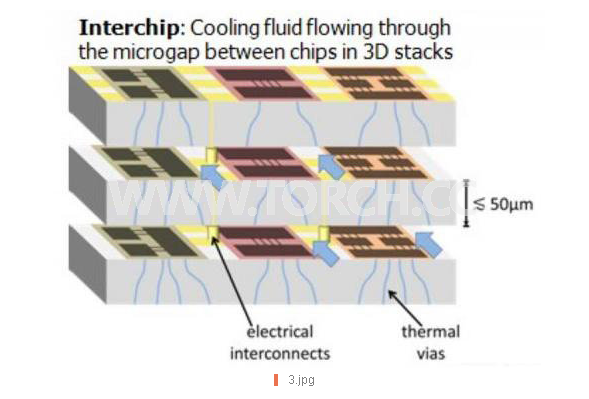 冷卻具有絕緣介電質(zhì)流體的3D芯片堆疊時(shí),該絕緣介電質(zhì)流體沸騰成蒸汽,并從間隔100微米距離的50微米堆疊中提取熱,使裸金屬通孔可在芯片之間運(yùn)行,如同水冷卻劑一樣形成互連而不至于造成短路。